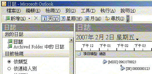 這個軟體叫 Smart Journal, 是裝在 PC 上, 不是裝在手機上… 只要每次 ActiveSync 一啟動, 它就會跟著跑起來, 會把 SmartPhone 上面的通話記錄都倒到 outlook 的日誌 (Y), 我的 outlook 就會有所有的通聯記錄了, 咳咳.. 它會記錄來電 or 去電, 沒接到的也會記, 如果通訊錄對的到, 就會直接秀名字, 也會有通話時間… 這個小軟體太棒了, 有用 windows mobile 的一定要去裝一下…