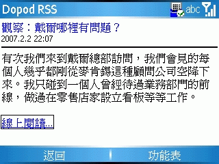 不過就算每天只同步一次, 這個軟體還真不錯用, RSS 剛好可以把這些消息大綱很快的上網抓下來, 然後就帶在身上無聊拿出來看一下… 如果 theme 換成多普達的, 在首頁還會隨機輪播 RSS 的文章標題… 現在到處都有 RSS 可以訂閱, 每天簡單更新一下就幾十則新聞自動跑進來… 遠比用 mail 或是 mobile favorites 方便太多了… 沒上網時就有東西可以看, 當然有上網時更棒… 可以直接連到網頁去看全文…