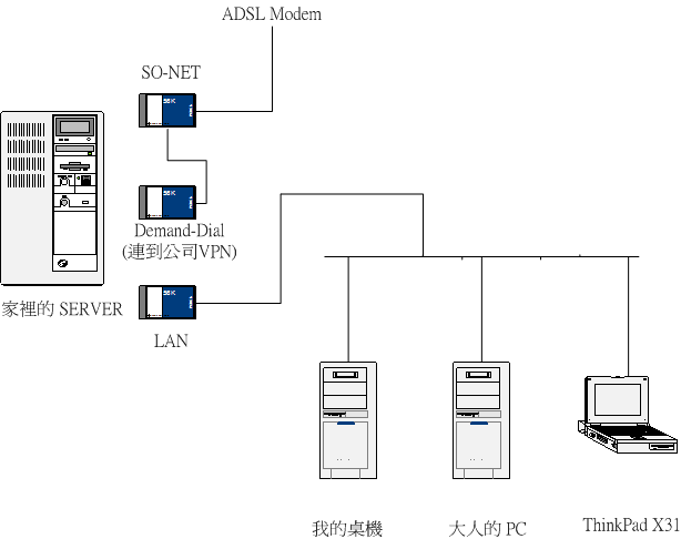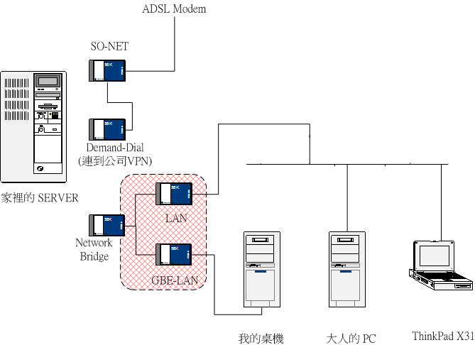 麻煩的是網路設定的地方… 原本的架構是這樣, 有點小複雜, 除了基本的 NAT 之外, server 上的 RRAS 也設定了 demand-dial, 會自動連到公司的 VPN, 同時也是 VPN server, 接受我在外面撥到家裡的區域網路, 其它 DNS, DHCP, IIS, Net Share 等等的就不畫了..