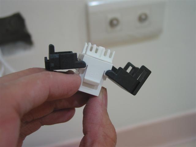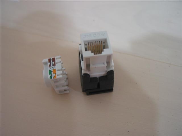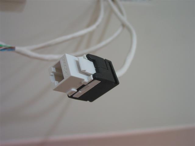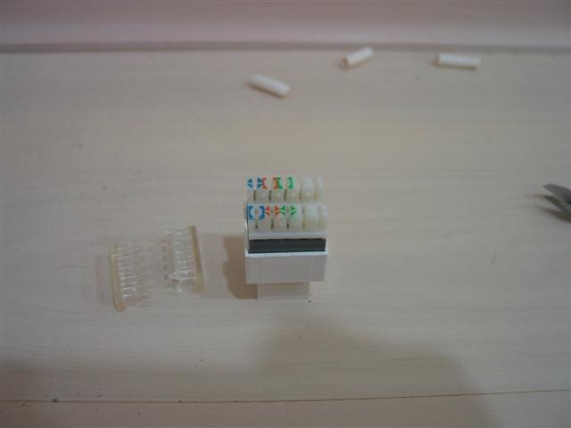 安裝就是這樣而以, 它的零件有兩片. 把小片的套環穿過剝好皮的線, 然後照著外面印的色碼標示, 把一樣顏色的線卡到縫裡, 多的線剪掉, 就完成第一步了. 通常壓這種東西最煩的就是 586A / B 的色碼實在不大好記, 這個接頭把順序調過了, 每對線都是白色的在前面, 有顏色的在後面, 做了一兩個頭之後連看都不用看就記起來了…