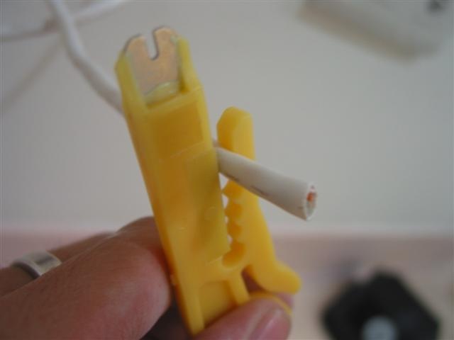 便宜好用的剝線刀, 線剪到適當長度後, 留個 2cm, 用剝線刀夾著繞一圈, 皮就剝掉了…