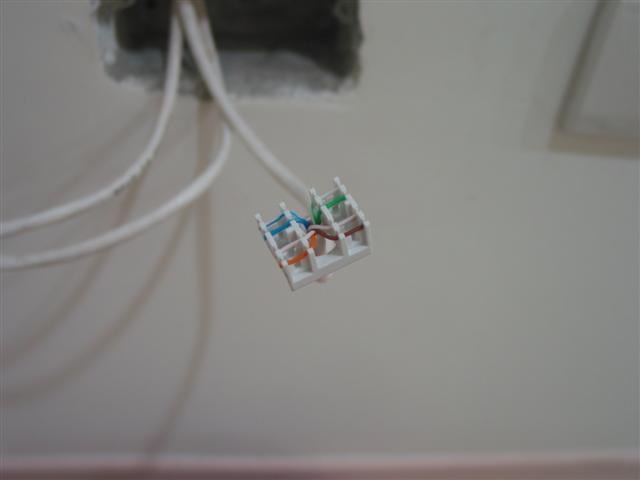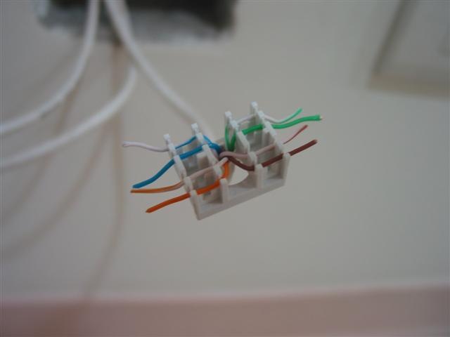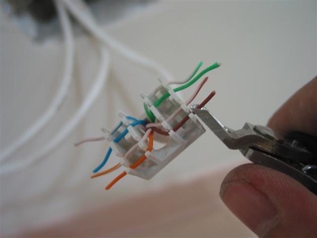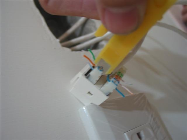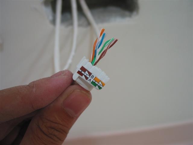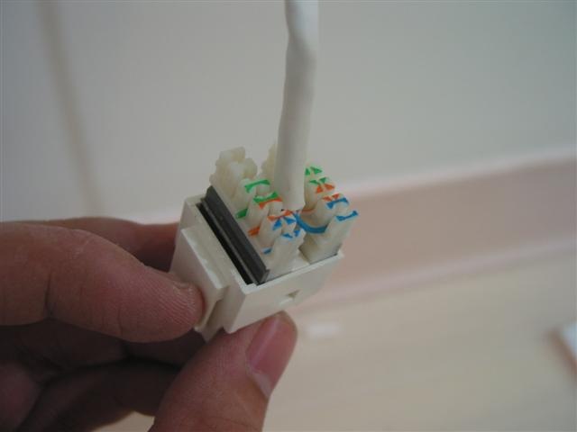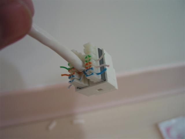 接下來是電話線的接頭. 這部份就沒那麼好命了, 買不到像剛才那種好用的, 這個就是普通的電話插座, 沒啥特別的, 得靠壓線工具, 剛才的剝線刀就派上用場了… 這個一樣有彩色標示, 照著線的顏色卡進去就好了. 只不過這邊不像 3M 的那麼輕鬆…