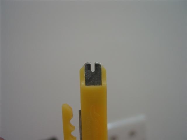 第一張圖是剝線刀的前端, 很陽春的壓線器, 把卡好的線用頭擠進去, 自然會有金屬片刺破線的外皮, 直接接觸到裡面的銅線… 六個接點都弄好後把多的線剪掉就好了. 不過這個稍微難弄了點, 以前沒有買工具, 用美工到弄半天弄到手很痛… 這次有買工具, 不過也是不小心壓壞一個接頭.. [:’(]