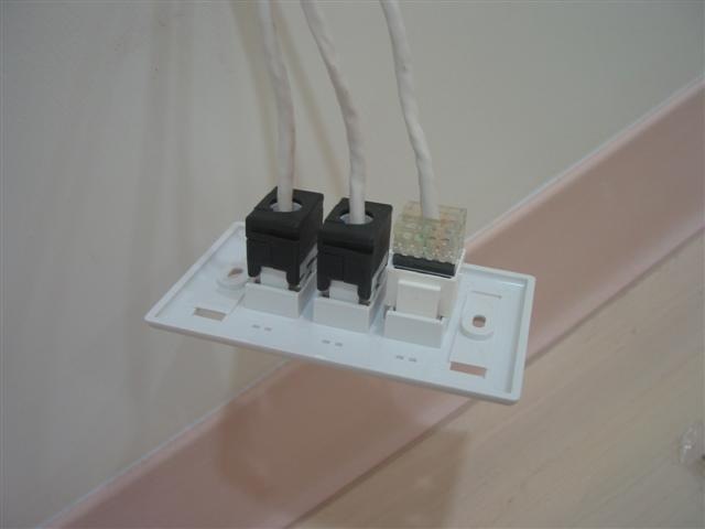 首先, 這是水電師傅幫我拉好的線, 線我是去買整箱的AMP Cat5e UTP 來用, 直接拉三條, 兩條網路用, 一條電話用… 這個線比 cable 細一點, 也軟一點, 所以我留的比較長, 大概 10 ~ 15 cm 都還塞的進牆壁…