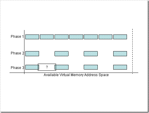 其中: (1) 就是在可用的定址空間內盡量塞,因為虛擬記憶體的關係,不管實體記憶體夠不夠,都能夠使用。 (2) 就是跳著釋放記憶體後的分佈情況。 (3) 圖上看來已經沒有能夠容納 “大一點” 區塊的空間了,那麼 [?] 這個區塊到底還放不放的下?