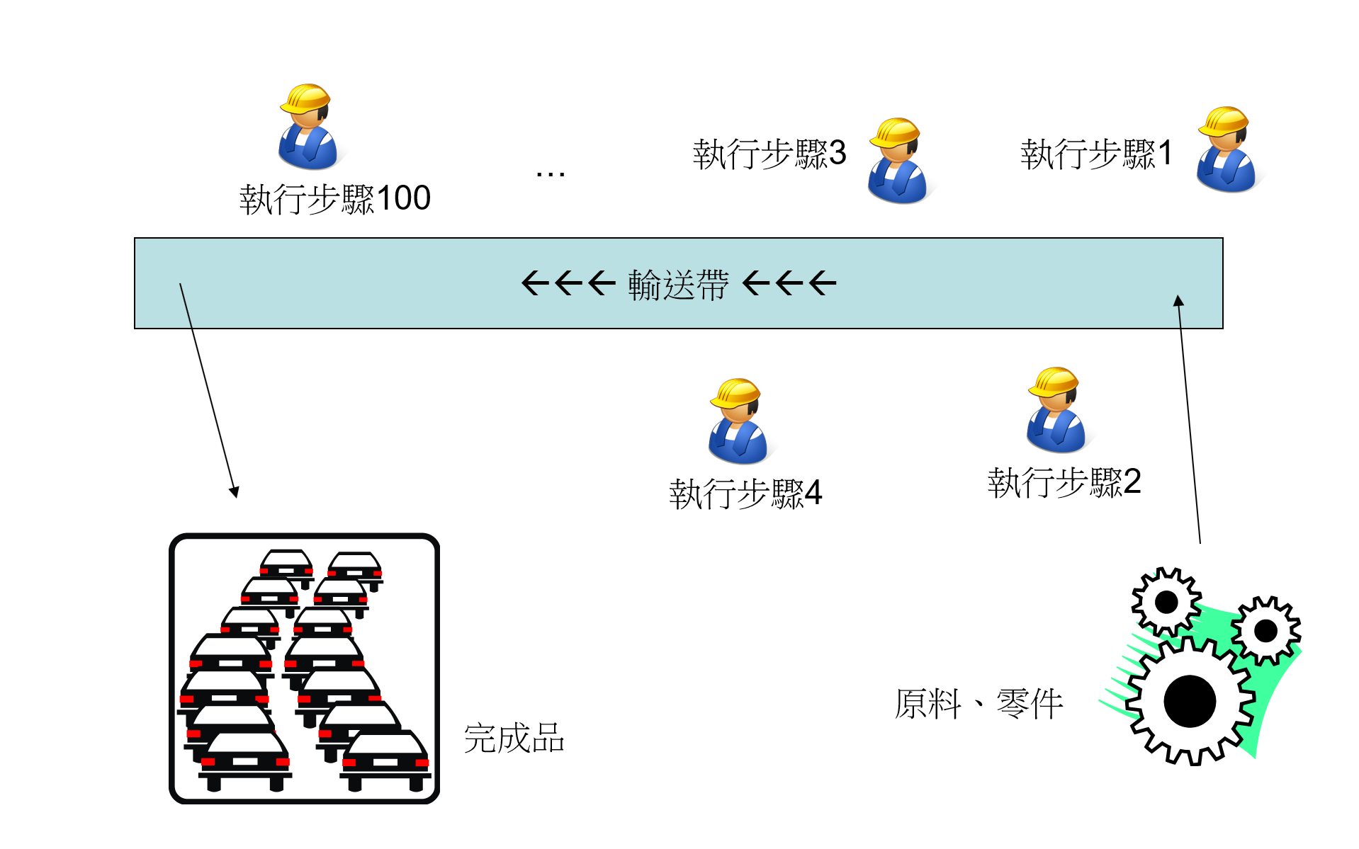 在大部份的情況下,工作都是有先後順序的。之前介紹的執行序集區,對這類的問題就起不了作用,因此本文提出另一種切割方式,能在這種情況下運用多執行緒: 生產線。生產線的運作模式,是源自當年福特汽車廠用來大量生產汽車的作法。在開始寫程式前,我們先來瞭解它的運作方式。生產汽車是件很複雜的工作,整個過程有很多步驟,在輸送帶上每個步驟都有負責的人員,依序完成他的步驟,那麼當零件走到輸送帶的末端,車子就完成了。我們先來看看這張說明生產線運作方式的概念圖 (如圖一):