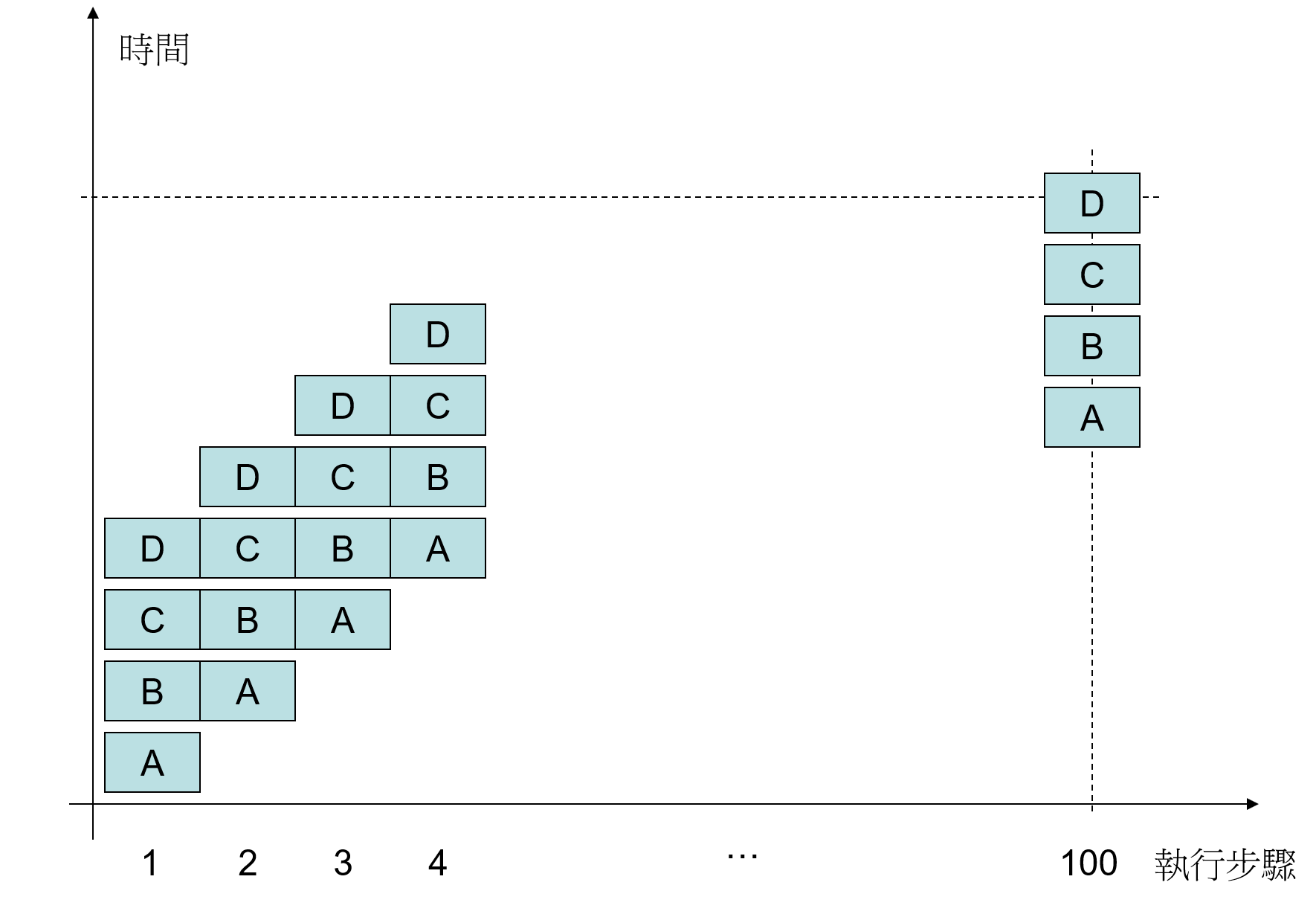 假設生產一量車子要 100 小時,整個生產線把它平分成 100 個步驟,則每個步驟只要花費 1 小時。每個步驟完成之後,輸送帶會把半成品帶到下一個步驟,直到完成為止。如果生產線只生產一台車子,是沒有任何好處的。如果生產線持續運作,結果就不一樣了。來看看每個步驟跟時間的關係圖 (如圖二)