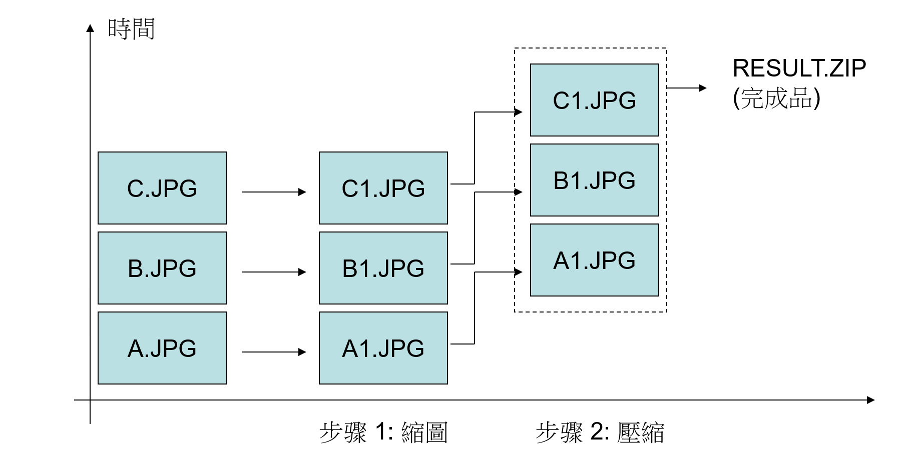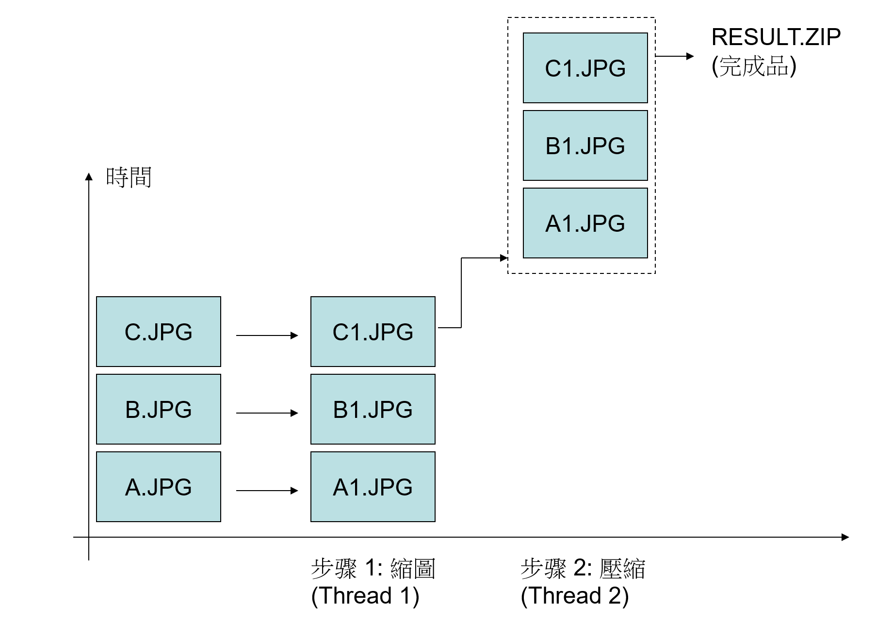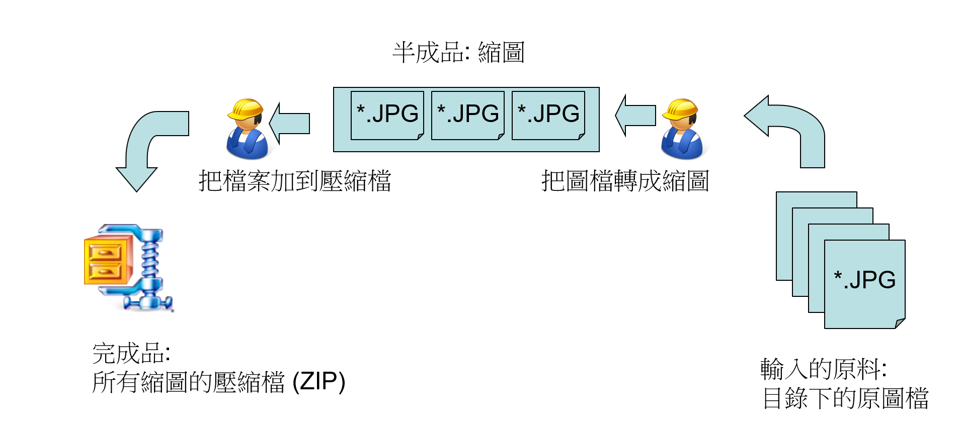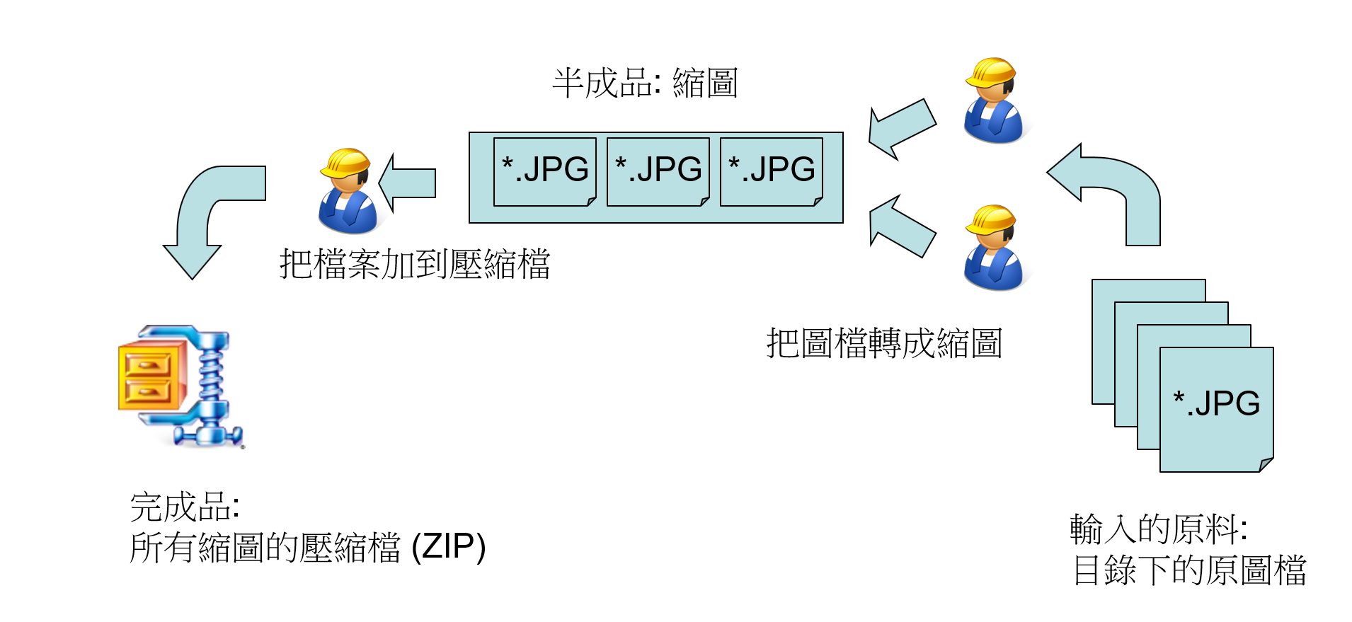 要開發多執行緒程式最大的障礙,一種是開發跟除錯的困難,另一種是很多程式本質上就很難切成多執行緒來增加效能。這時必需用另外的設計模式來解決這個問題。這次的範例程式延續上一篇 [執行緒集區] 的例子: 批次處理大量照片。只不過我們把需求調整一下,這次的要求是把每張照片(*.JPG)轉成縮圖(*.PNG)後,最後還要把所有的照片檔再壓縮成一個 ZIP 壓縮檔。