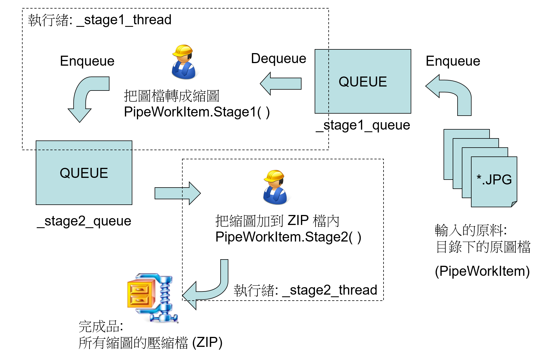 概念上每個階段是靠輸送帶,把半成品從上一階段送到下一階段。程式實作則是用佇列(QUEUE)來扮演兩個階段之間的輸送帶。原料(原圖圖檔)會包裝成 PipeWorkItem 物件,送到 _stage1_queue ,而 _stage1_thread 執行緒會不斷的把 _stage1_queue 裡的 PipeWorkItem 取出,執行完它的階段作業 Stage1() 之後,把半成品放到送到 Stage2 的佇列: _stage2_queue。同樣的 _stage2_thread 執行緒也會不斷的把 _stage2_queue 內的 PipeWorkItem 取出執行 Stage2( ) 。所有的 PipeWorkItem 都執行完畢之後,程式就完成它的任務了。而階段之間就靠 ManualResetEvent: _notify_stage2 來同步。必要時階段 2 會閒置,直到階段 1 通知它有新的工作才會醒過來。