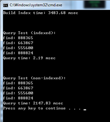 Console.WriteLine("\n\n\nQuery Test (indexed):");