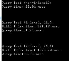 Console.WriteLine("\n\n\nQuery Test (indexed, dic):");