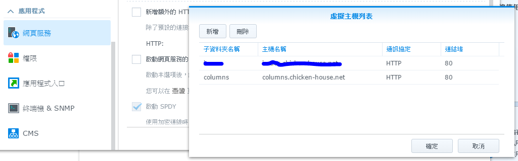 Synology DSM 的控制台,底下有 Web Station, 先用正常的介面,建立 virtual host, 綁到 columns.chicken-house.net 這個 hostname (80)