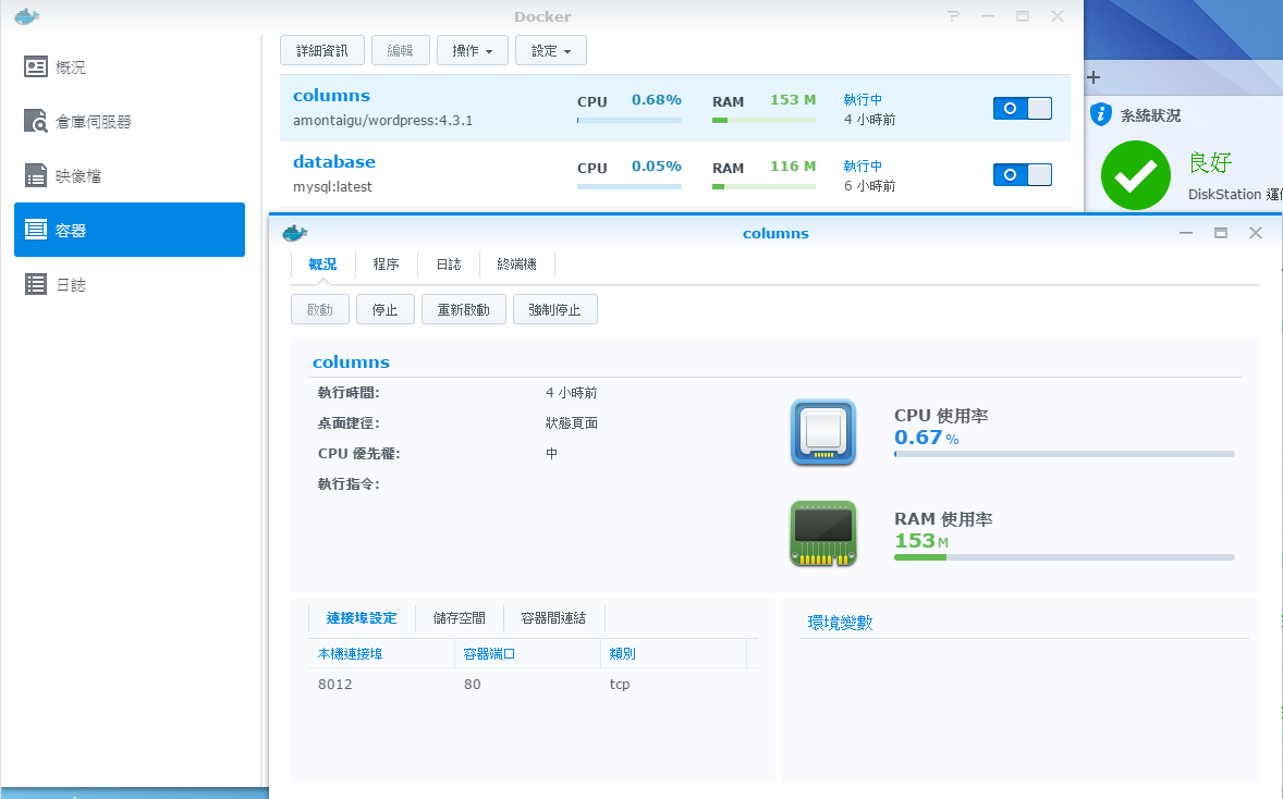 在 Docker 上安裝 WordPress + MySQL, 也是小事一件,最花時間的就是… 就是下載 image … 這我也跳過。比較特別的是,不知是 Synology 搭配的 Docker 套件問題,還是別的的問題 @@,WordPress 官方版的 image 開 DSM Docker 管理員的 terminal 就很容易會整個 container crash .. @@,不過因禍得福,意外發現有人用 Nginx 這個新興的 web server 架設的 WP image.