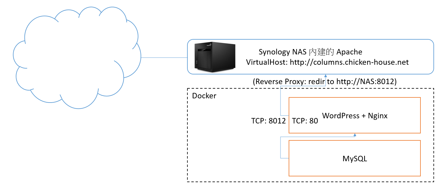 上圖是我現在家裡的網路架構,這時碰到的問題在於,PORT 80 早就被 NAS 內建的 apache 搶去用了。WordPress 若要用 80 PORT 就沒辦法了。DSM 也沒地方讓你把 PORT 80 放出來,二來就算放出來,我也沒辦法讓兩個以上的 container 都 mapping 到 80 PORT… 這樣要開放對外網站就顯得很棘手… 最終 WordPress 分配給他 8012 這個 port, 總不能叫所有的網友,以後要看我的文章要連這 PORT 吧? @@