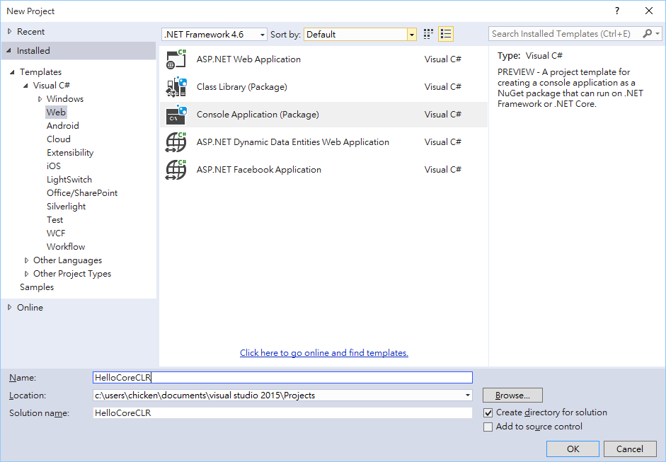 開啟 Visual Studio 2015, 新增專案。這邊要留意的是專案類型,不知 RTM 後會不會改.. 我是找 Visual C# / Web / Console Application (Package) 才找到的, Console 歸類在 Web 下是有點怪.. 這邊的專案才是支援 Core CLR 的版本。建立名稱為 “HelloCoreCLR” 的新專案