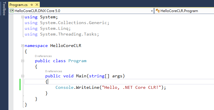 左上角 runtime 切到 DNX Core 5.0,補上一行印出訊息的 Code,按下 Ctrl-F5 執行
