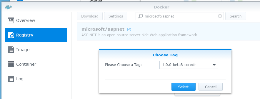 到 Docker / Registry 搜尋 image, keyword: microsoft/aspnet, 我是指定 tag: 1.0.0-beta8-coreclr