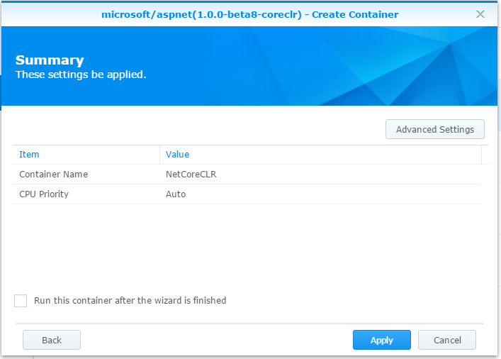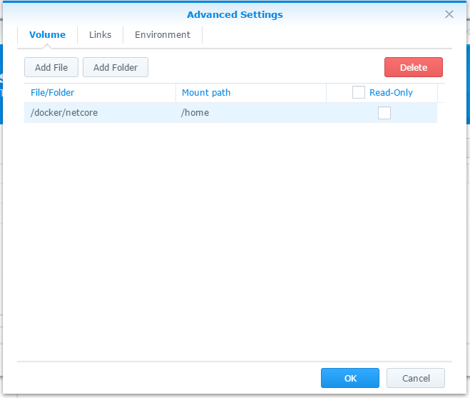 按下 “Advanced Settings”, 加掛目錄到 container 內,等等可以簡化把檔案丟進去的過程。把 NAS 的 /docker/netcore 目錄,掛載到 container 內的 /home 目錄下,取消 ReadOnly 的選項。