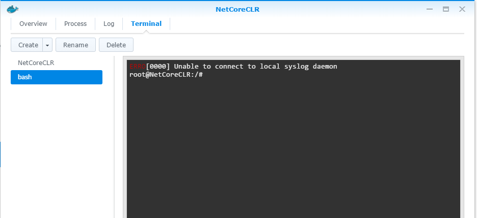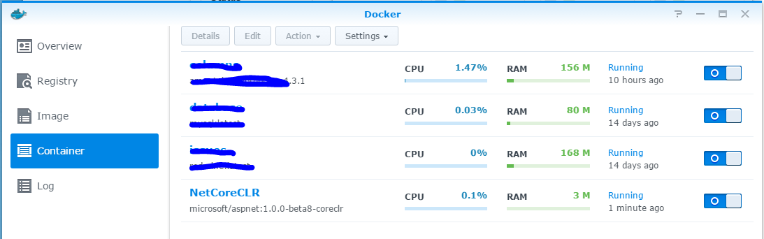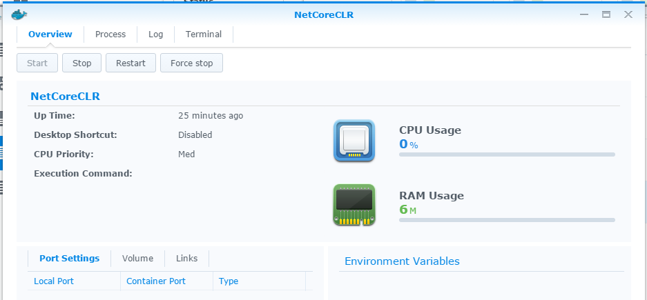 果然 NAS 包裝過的 Docker 簡單好用的多,省了很多腦細胞… 最後補張圖,大家猜猜這樣的 .NET Core CLR 環境需要吃多少記憶體? 很省啦,整個 container 才 6M ..