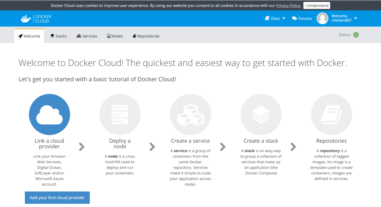 Docker Cloud 是 Docker 旗下的服務之一,跟 Docker Hub 這公開的 Repository 都共用同一組帳號。Docker Cloud 前身是 Tutum,專注在提供良好的 Docker 託管服務。所謂的 “託管”,就是只幫你做管理而已,而 Hosting 這件事則是你自己處理,你可以用 Azure, Aws, 甚至自己準備機器都行,Docker Cloud 則提供了很好的整合介面及服務,幫你把這堆複雜的問題簡化成單一介面。