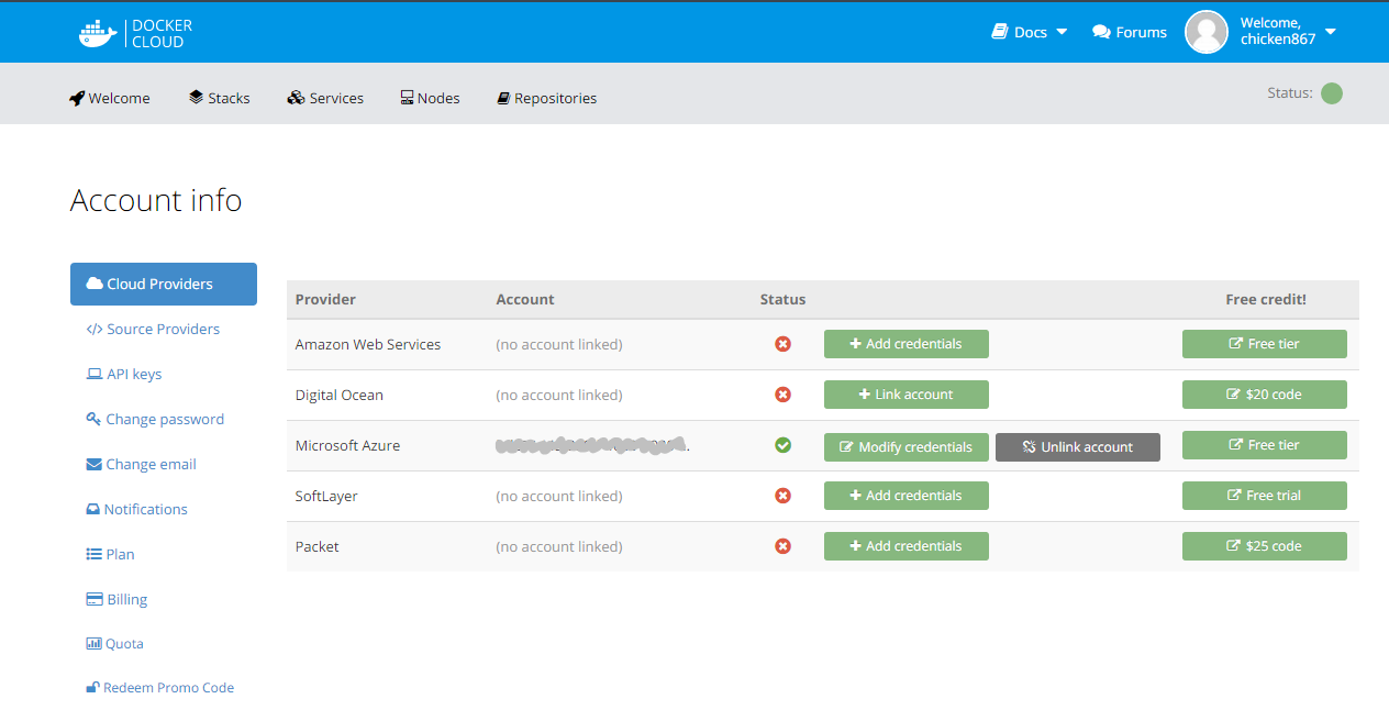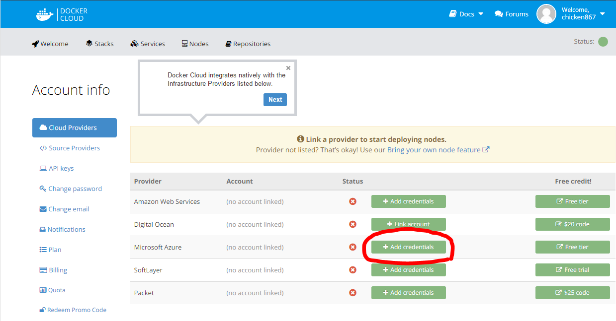 連結你其他雲端 IaaS 服務的帳號。Docker Cloud 支援這幾種,今天要示範的是 Windows Azure: