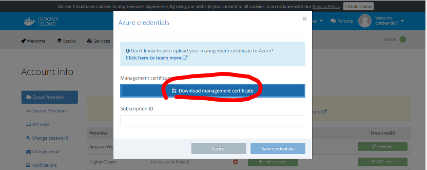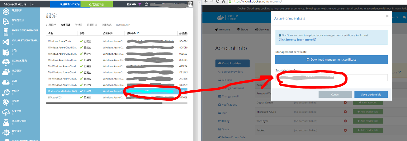 這邊要設定 Docker Cloud 跟 Microsoft Azure 兩者間的授權連結。你要先從 Docker Cloud 下載管理憑證,然後稍後把這個憑證上傳到 Microsoft Azure, 最後回填 Microsoft Azure 的 Subscription ID, 就完成整個授權的動作。完成之後 Docker Cloud 就能代表你去 Microsoft Azure 建立 VM 等等細節。