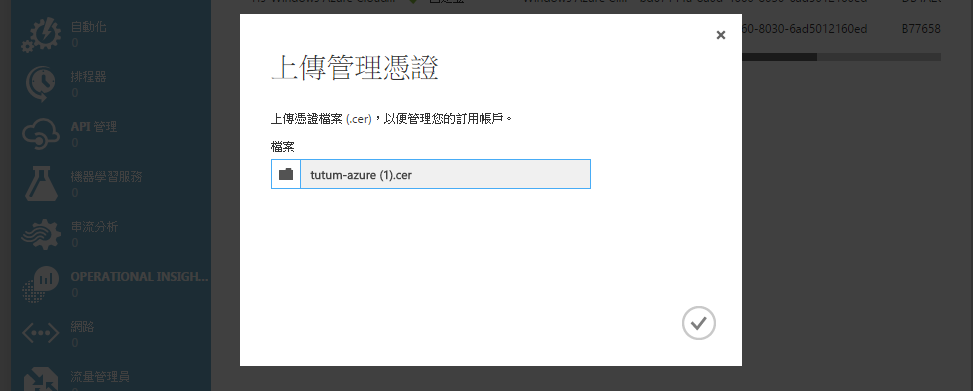 在就版的 Microsoft Azure Management Portal 內,左方的 [設定],切到 [管理憑證] 頁籤,上傳前一個步驟從 Docker Cloud 下載的憑證。完成後把你的 Subscription ID 填到 Docker Cloud 的畫面就大功告成!