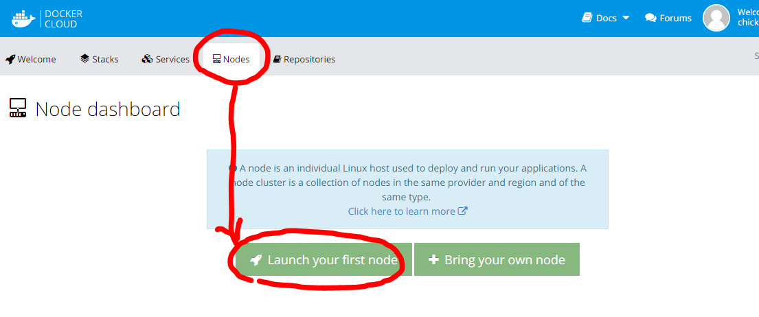 OK,因此我們現在要建立第一個 Node,從 Docker Cloud 的 Nodes > Launch your first node,可以看到下列畫面: