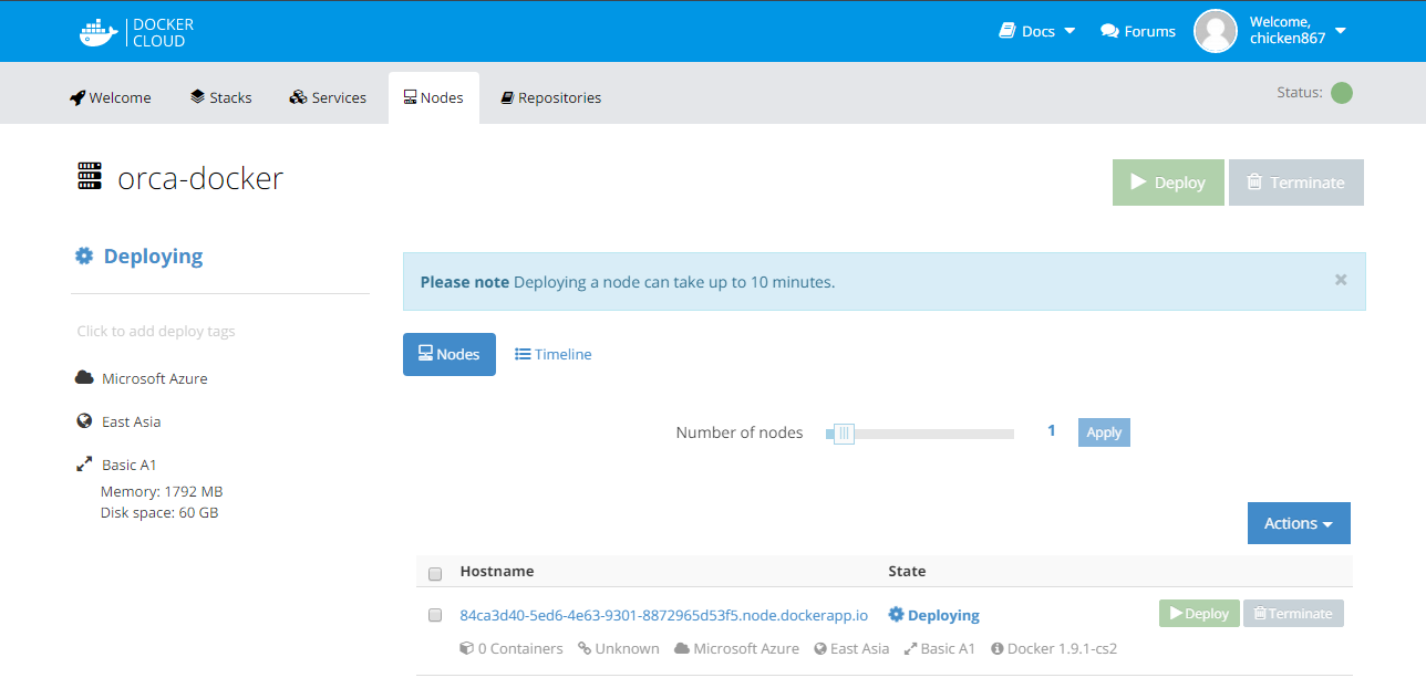 這邊你可以選擇你要在哪個供應商的服務上面建立 Node。這邊當然是選 Microsoft Azure, 你可以同時指定 Azure 的機房地點、VM 的規格、你要一次建立幾台、還有你的 Disk size 要配置多大。完成後按下確定,接下來等幾分鐘等她佈署完成就可以了。這邊我選擇的是 Basic A1 等級的 VM (1 CPU, 1.75GB RAM) + 額外的 60GB HDD