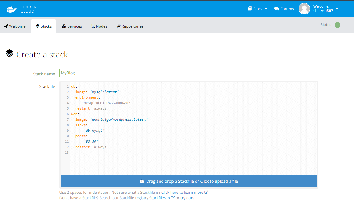 這邊只有兩個設定,一個是你的 Stack name, 放的是整個服務的名字,我這邊填 “My Blog” 。Stackfile 則是放你的組態檔,你可以點下方 “try ours” 他會幫你填個範本進來.. 我這邊自己寫了一組: