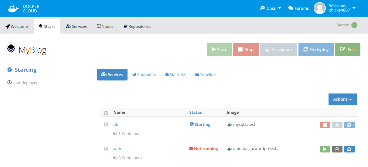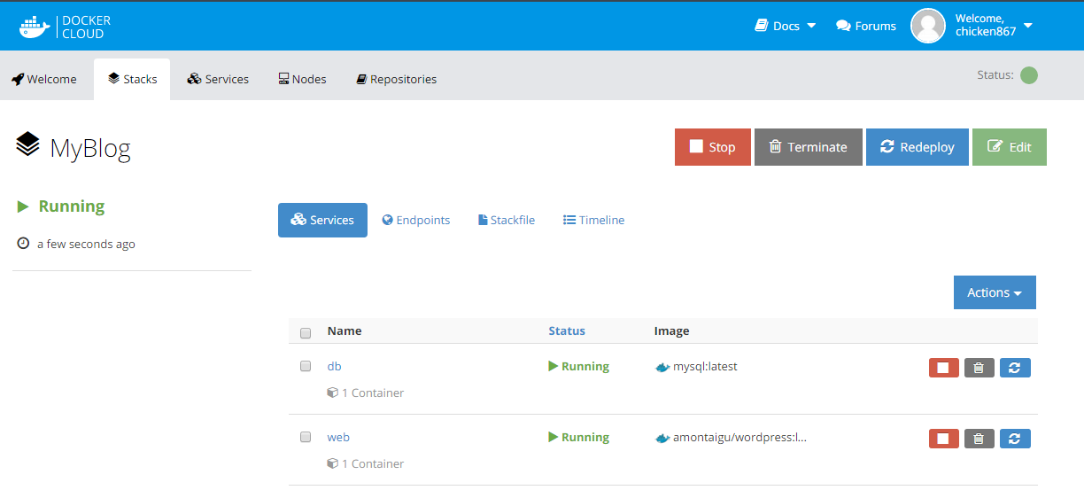 按下 “Save and Deploy” 後,Docker Cloud 就會接著替你把後續的動作搞定了。從 Stacks 畫面可以看到,按照設定,兩個對應的服務 (db & web) 就按順序被建立起來了。一樣等 3 ~ 5 分鐘就好了。