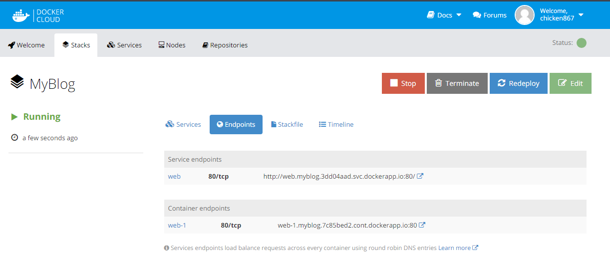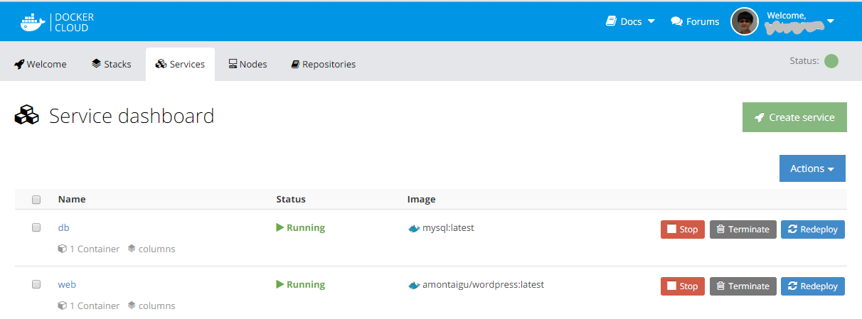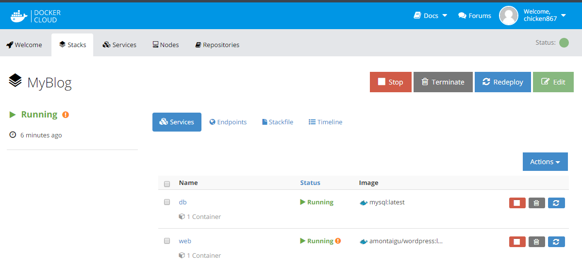操作到這邊,是不是很簡單? 原本我只是想找個像 Synology Docker 一樣的管理介面來用,後來發現 Docker Cloud 已經遠遠超過我的想像了! 做這些 Hands On Labs, 總讓我有個感想,當年透過 Azure Cloud Service, 很簡單就得到這樣佈署管理的能力,讓我感動了很久。沒想到發展到現在,同樣層級的管理能力已經可以做到跨越不同的雲端服務了,甚至是我這種 Linux 新手自己自建的服務都可以做到這種層級的服務水準… 時代的進步果然是快到無法想像..