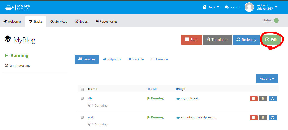 Docker Cloud 會自動偵測有哪些服務需要重新佈署。在 Running 的狀態旁邊會有明顯的 ! 警告,你必須重新佈署 (Redeploy) 才會生效。你可以按上方的 Redeploy 按鈕,重新佈署整個 stack, 或是針對特定的 service / container, 只重新佈署特定的部分即可。重新佈署就是剛才提到,砍掉 container 重新建立一次而已,有是先做好規劃的話資料跟服務都不會中斷。