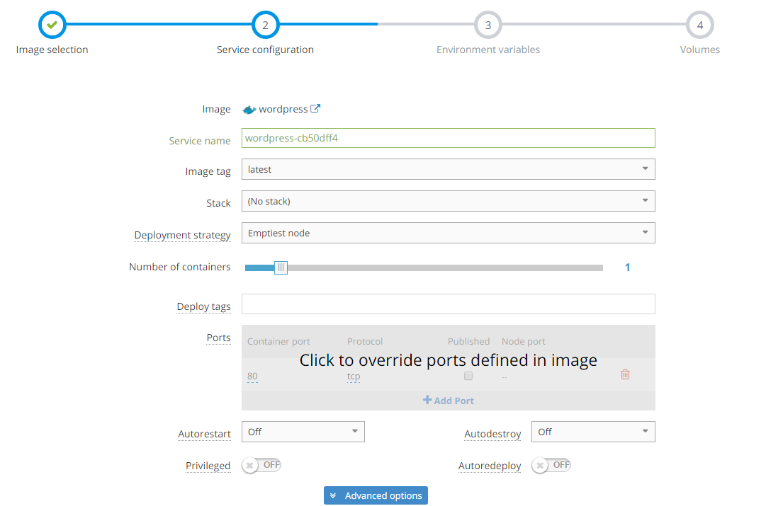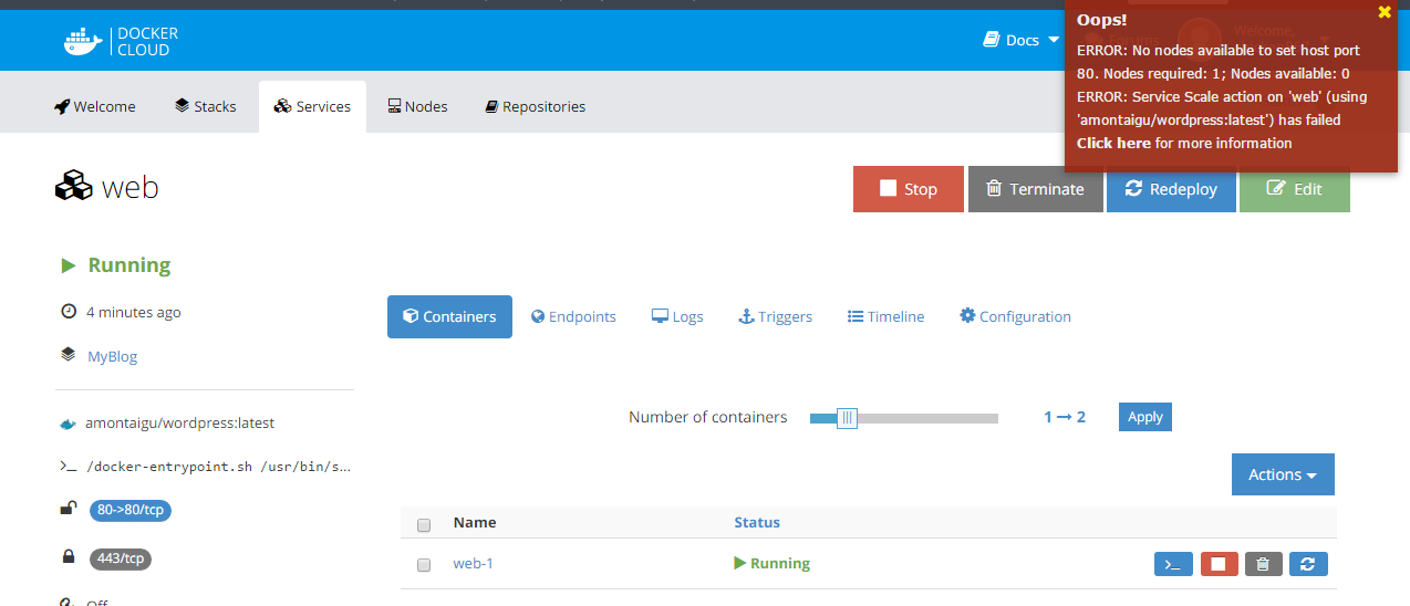 不過,因為我已經指名要對應 80 port, 你必須有第二個 node 才能佈署第二個 container, 因此跳出這個警告… 要避開這個限制,你可以指定動態的 Ports mapping。這麼一來,每個 container 不會占用同一個 port, 就不會有這個問題。不過這麼一來,你就必須再前端多架設一個 reverse proxy, 替 user 做 port 的轉址。各位可以自行想像一下.. 如果你成功的用兩個以上的 container 提供你的 service, 那麼在重新 redeploy 時,你只要一次 redeploy 一個,完成後再 redeploy 第二個,你的服務就完全不會中斷。