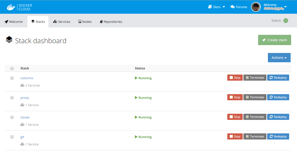 這是我的 SERVER 上提供的所有服務 (stacks),columns 就是這個部落格服務,裡面有 web / db, 而我還有其他服務都要共用 80 port, 因此我把 proxy 獨立成第二個 stack. 其他 issues 是 redmine, git 是 gitlab-ce 的服務,都是用一樣的方式建立的。會很麻煩嗎? 其實不會,從開始研究 Docker Cloud 開始,到建立完成,才花了一天不到的時間…