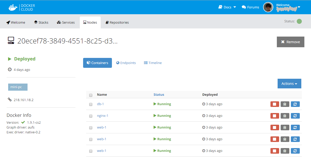換個管理的角度,看看我的 node 上總共跑了那些 container? 當然也可以看所有的 endpoints, 或是用流水帳 (timeline) 顯示過去的操作歷程.. 我個人用的情況,機器是我自己的 (就是上次的敗家文,對岸淘寶買的 MINI-PC),加上只有一個 node, 因此 Docker Cloud 上的服務也是免費的。完全免費的情況下,能得到過去要用雲端大廠才擁有的 IaaS / PaaS 才有的服務,真的是太划算了。強烈推薦各位,有需要的話絕對值得試一試~ 如果實際工作上有需要,我想花一點費用來託管,省下一個專職的管理人力,也是很划算的。
