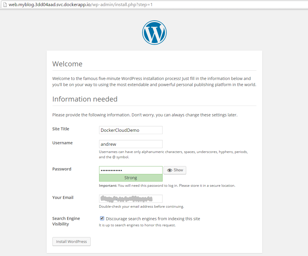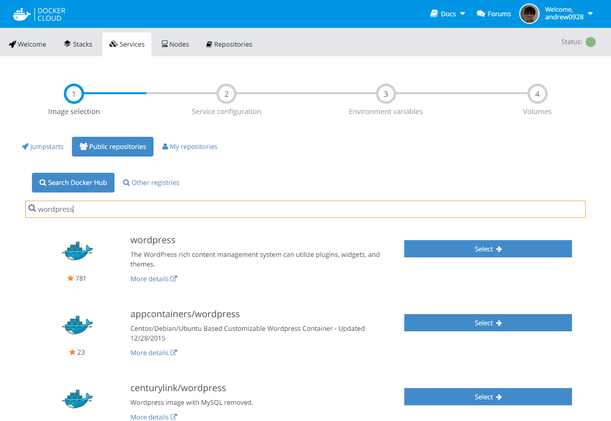 只要到 Services > Create service, 就可以跳到這畫面。我打了 keyword: wordpress, 就列出所有我可以用的 images: