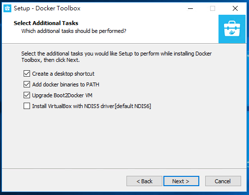 這次不碎唸了,直接開始正題。Docker Toolbox 是個 Docker 的常用工具箱,讓你可以一次解決在 Windows 下使用 Docker 的所有必要套件。裡面包含 Oracle VirtualBox, 幫你準備好執行 Docker 用的 Linux VM。