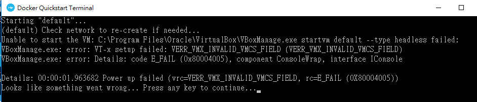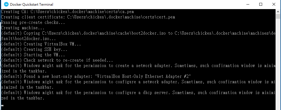 安裝過程就不多說了,全部都照預設值安裝… (後面會說明要注意的地方),一路下一步跑完就結束了。安裝好之後,直到我按下 Docker Quickstart Terminal 才發現不對勁…
