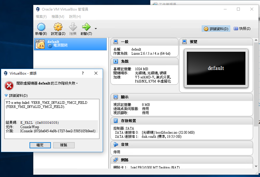 直接開 Virtual Box 來看,也是碰到一樣的問題: