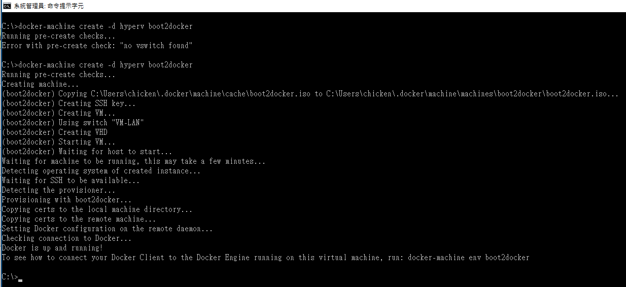 接下來,直接開個 DOS Prompt, 用 Docker Machine 建立 VM 試看看。我用的指令: