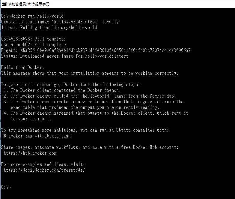 用過 Docker 的人看了就懂了,我就不用多說… Docker Client 直接跟 Docker Host 溝通,去 Docker Hub Pull 這個 container image 回來執行… 印出來的那堆 message 就是執行的結果,代表你已經成功的執行這個 container