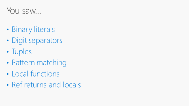 這個 session 提到這幾個 C# 7 新的語法 (Visual Studio 15 Preview 尚不支援 Tuples & Records,其餘都已可體驗使用)