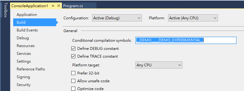 受惠於 Roslyn 的架構,編譯器及 IDE 要支援這些語言的新機制更容易了。這次的 VS 15 就已經內建了 C# 7 的支援,只不過預設是停用的,要啟用它的話,需要在你的專案裡面條件式編譯,定義這兩個 symbols: DEMO, DEMO_EXPERIMENTAL 。