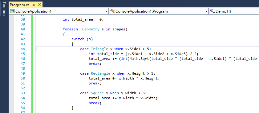 - 用 switch + pattern matching 區分各種物件,直接在 switch case 內引到到不同的程式碼去計算面積