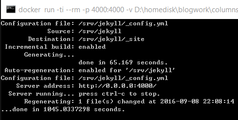 docker run -ti --rm -p 4000:4000 -v D:\Blog:/srv/jekyll jekyll/jekyll:pages jekyll s --watch --force_polling