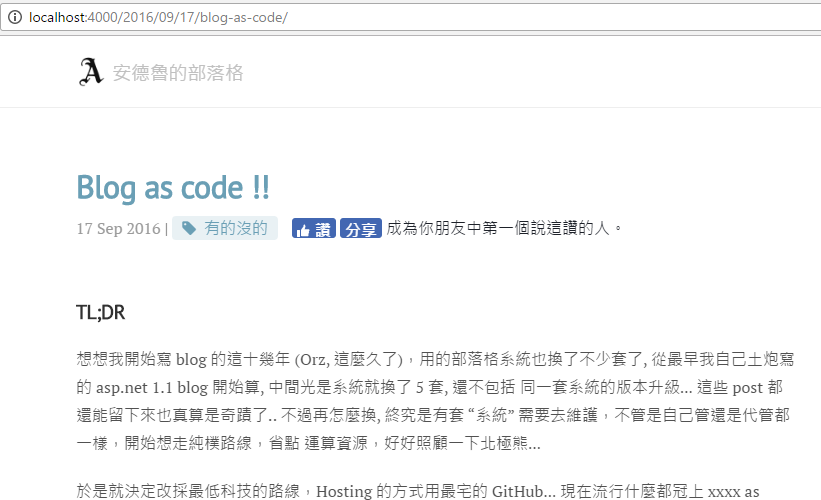 過程中還有很多沒沒角角我沒寫的,包含怎麼轉資料,怎麼匯入 comments,還有如何用 Liquid template engine 的語法打造自己的 template 等等。 這邊純做個架構介紹,告訴大家這樣用的優缺點。我用的環境算是比較怪的,一般會用 jekyll 這類 solution 的都是熟 linux / open source 的人, 這些應該都不成問題,我這種算是特例 XD