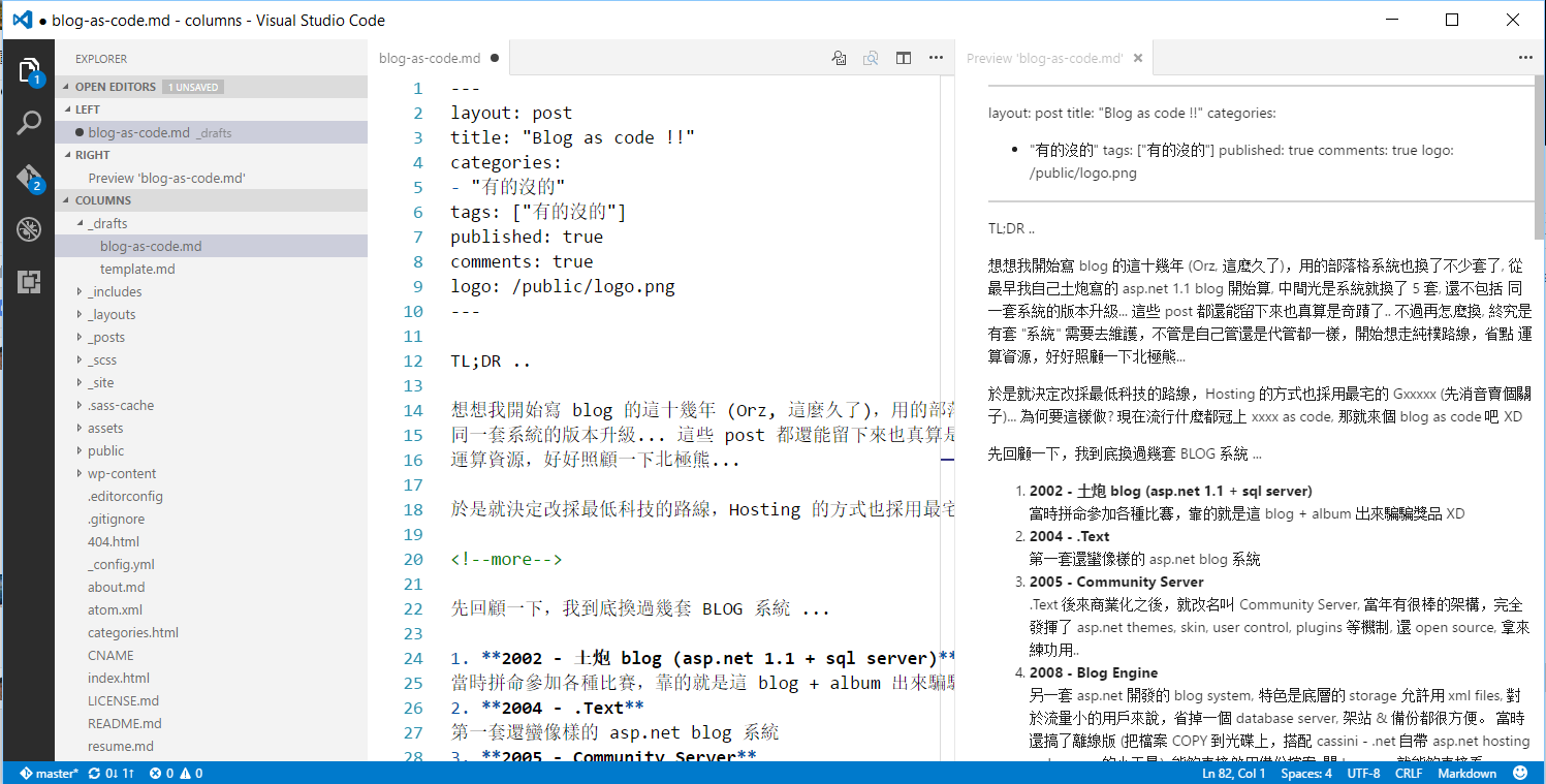 這不就是 visual studio code 嗎? 看來太完美了,都是 for developer 用的黃金組合… github + vscode 用過的就知道了,不用我多介紹啦~ 貼張 vscode 寫 markdown 的圖意思一下就好: