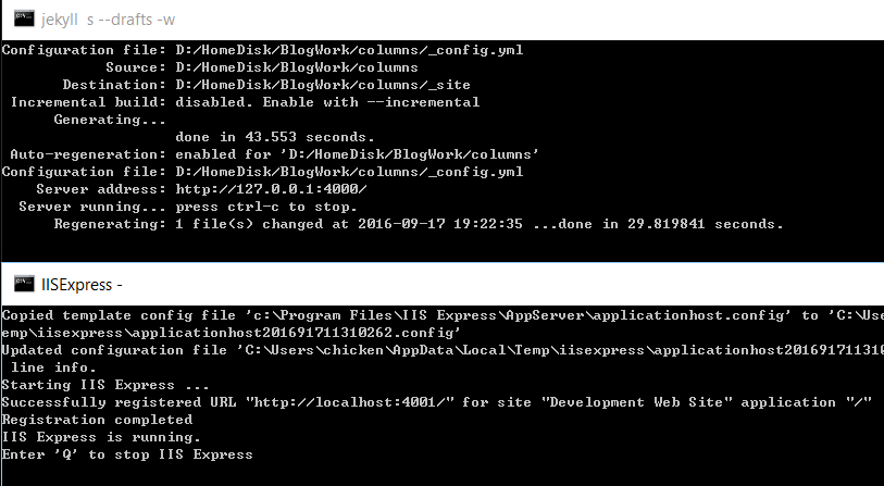 jekyll 本身自帶 web server, 在 windows 下不支援中文檔名, 所以我最後用 jekyll s, 開 –watch 持續監控檔案異動, 負責 port: 4000, 然後另外開 iisexpress 負責 port: 4001, 我自己視需要決定要連哪個 site.. -