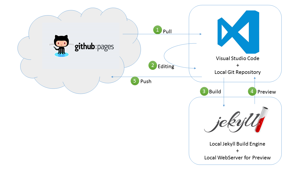 流程很簡單,就是按照圖上的標示,由 1, 2, 3, 4, 2, 3, 4, 2, 3, 4 …., 5 的順序不斷重複而以。這邊 GitHub Pages 跟 VS Code 都不會有什麼大問題,裝了就是了。問題最大在 local 要架設 jekyll 的話會是個大工程 (尤其是在 windows 下) … 我試過這三種作法, 給大家參考看看
